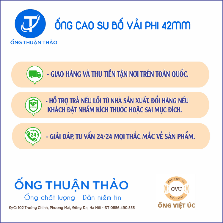 Ống Thuận Thảo cam kết cung cấp dịch vụ tư vấn và hỗ trợ sau bán hàng chuyên nghiệp cho khách hàng. Đội ngũ nhân viên giàu kinh nghiệm sẽ tư vấn cho khách hàng về lựa chọn và sử dụng ống cao su bố vải phi 42mm phù hợp nhất cho nhu cầu của họ. Đồng thời, Ống Thuận Thảo cam kết hỗ trợ khách hàng trong việc cung cấp thông tin kỹ thuật, hướng dẫn lắp đặt và giải đáp mọi thắc mắc sau khi mua hàng.