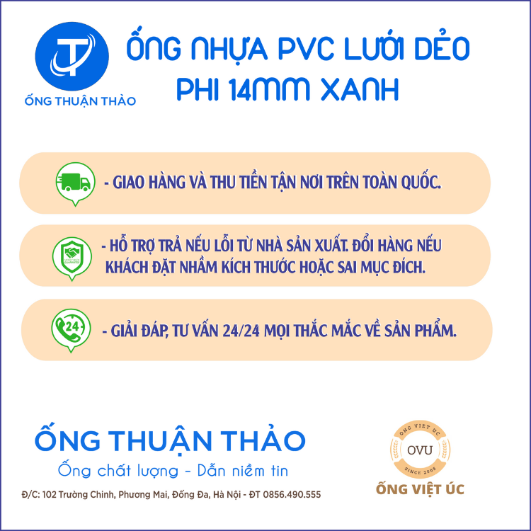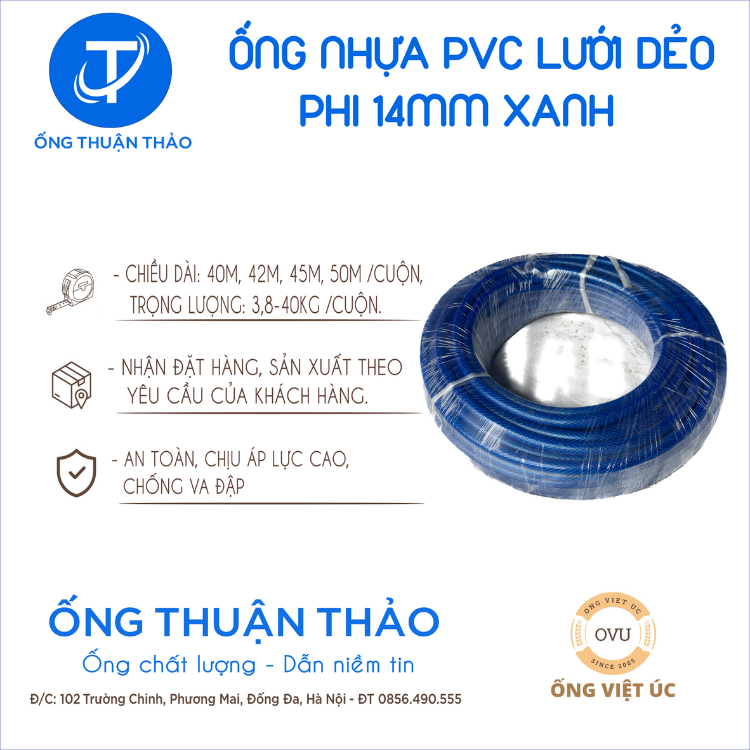 | Tên sản phẩm | Ống Nhựa PVC Lưới Dẻo Phi 14 | | Thương hiệu | Ống Thuận Thảo - Ống Việt Úc | | Cấu tạo | Gồm 3 Lớp: 2 lớp nhựa PVC và 1 lớp chỉ Polyester | | Kích thước | 14mm | | Độ dày | 1.5 - 2.5mm | | Chịu áp lực | Chịu được áp lực vừa phải | | Công dụng | Ống đặc biệt k có mùi hôi, dễ lau chùi, an toàn, không ô nhiễm môi trường. Sử dụng trong nhà, ngoài trời, các vị trí gấp khúc, uốn quanh mà ống cứng không luồn lách được, Giá thành hợp lý, chất lượng tốt. | | Đơn giá tham khảo | 250.000 | | Chính sách KM | - Giao hàng tận nơi trên toàn quốc